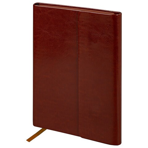 Внутренний блок включает 160 листов белой бумаги плотностью 70 г/м2. Каждая страничка имеет перфорированный угол. Благодаря стандартному формату А5 ежедневник удобно использовать как в офисе, так и на выездных деловых встречах. Интегральная (мягкая) обложка, выполненная в классическом коричневом цвете и стилизованная под гладкую кожу, фиксируется магнитным клапаном, поэтому ежедневник не откроется в сумке или портфеле и страницы не помнутся. Подходит для горячего тиснения. Дополнением является закладка-ляссе, с помощью которой при необходимости можно быстро открыть ежедневник на нужной странице. Помимо прочего ежедневник снабжен обширным справочным материалом.