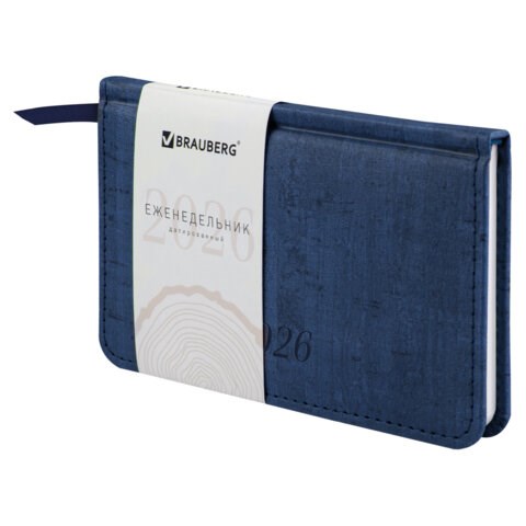 Еженедельник датированный 2026 МАЛЫЙ ФОРМАТ 95х155 мм, А6, BRAUBERG "Wood", под кожу, синий, 117195