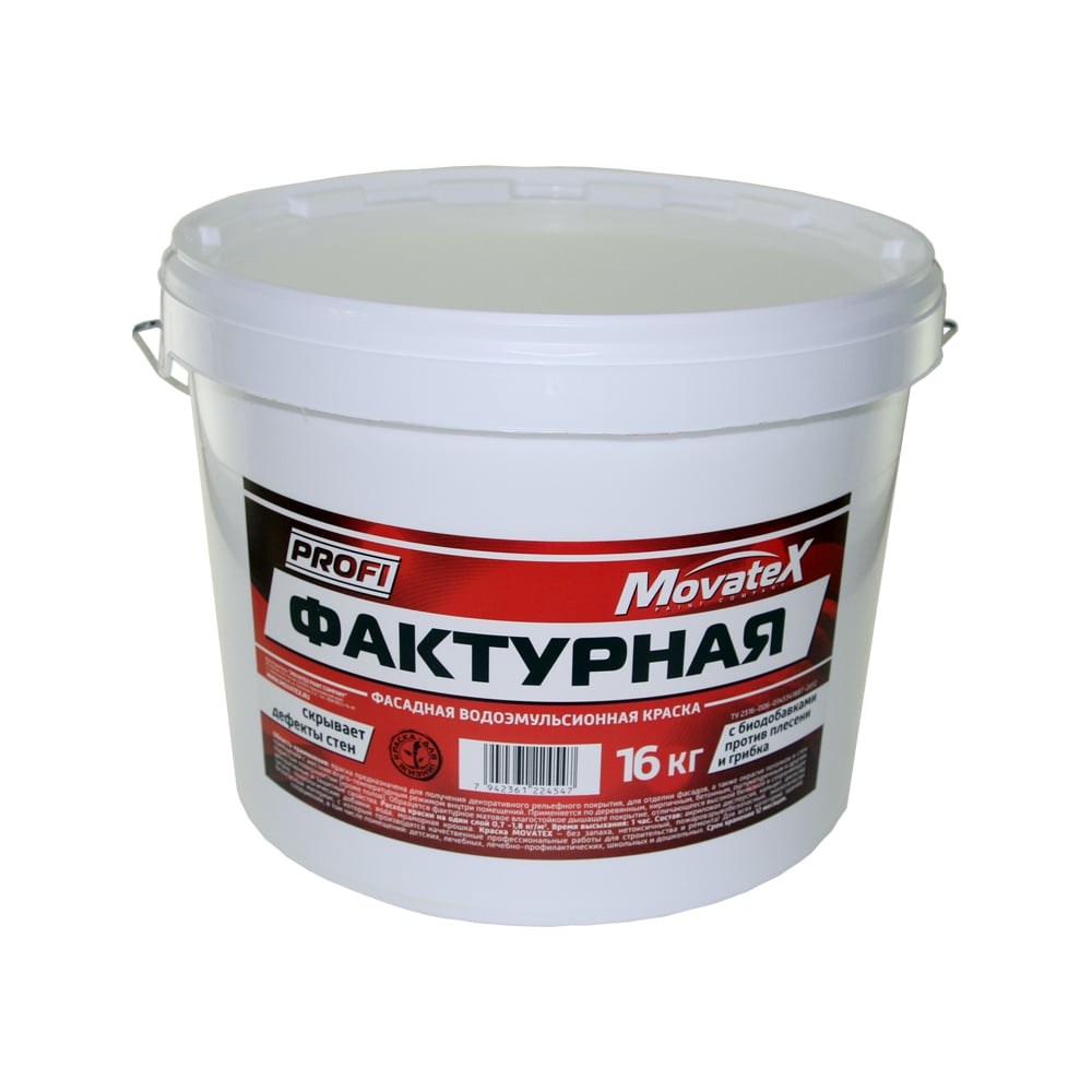 Водоэмульсионная краска Movatex PROFI фактурная, 16 кг Т20508 наносится на деревянные, кирпичные, бетонные, оштукатуренные и другие пористые основания. Продукт предназначен для получения декоративного рельефного покрытия. Мраморная крошка в составе маскирует дефекты стен. Благодаря стойкости к неблагоприятным факторам окружающей среды, средство можно использовать для наружных и внутренних работ. Краска на акриловой основе не имеет запаха, безопасна для здоровья, применяется для работ в детских и лечебных учреждениях. Для получения качественного покрытия рекомендуется предварительно обработать поверхность грунтом "Movatex".
