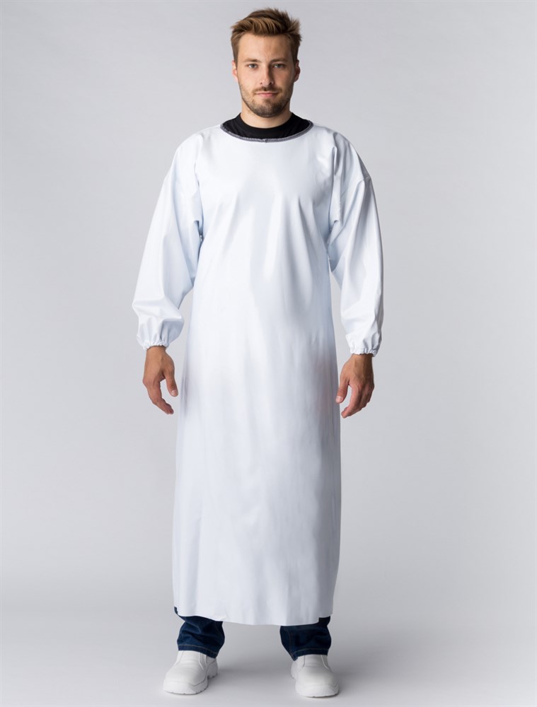 ФАРТУК-ХАЛАТ: - изготовлен из ПВХ-ткани, плотностью 500 гр. - швы герметизируются током ВЧ - шейная тесьма выполнена резинкой шириной 4 см - длина поясной стропы регулируется с помощью трезубца - используется в забойных цехах, у рыбообработчиков, на мойках - длина 140см