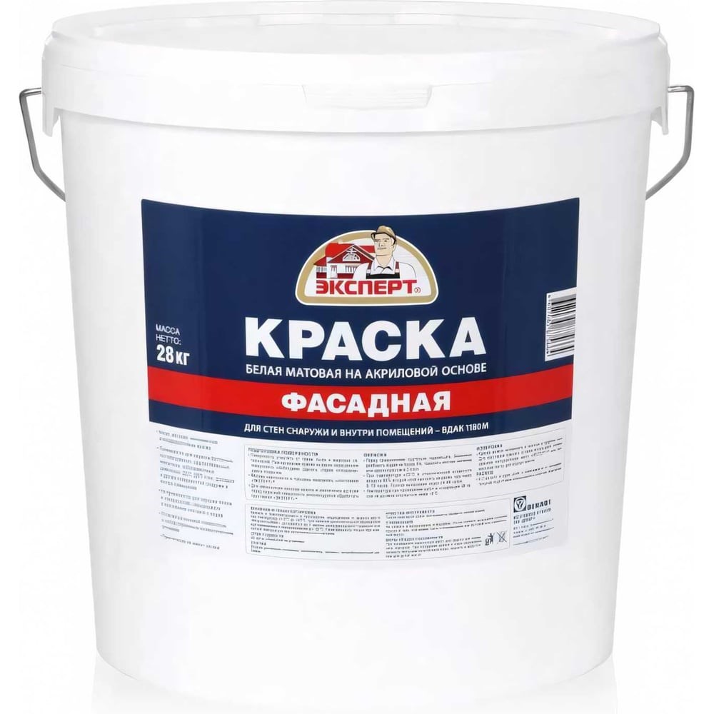 Фасадная краска ЭКСПЕРТ 28 кг 11229 применяется для окраски фасадов и цоколей зданий, а также стен снаружи и внутри помещений. Наносится на бетонные и оштукатуренные поверхности. Состав образует прочное стойкое к атмосферному воздействию покрытие, пригоден для применения в районах со сложными климатическими условиями. Обладает высокой степенью белизны и укрывистости. Возможна ручная колеровка акриловыми колорантами или пигментами для красок на водной основе.