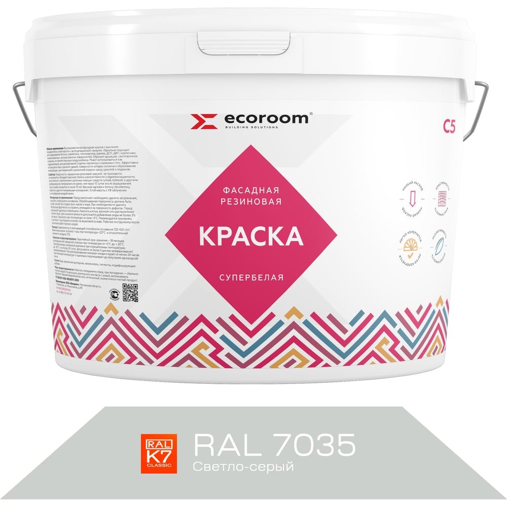 Фасадная резиновая краска ECOROOM RAL 7035 светло-серый, 14 кг, Е-Кр -119/7035. Высокоэластичная фасадная краска с высокими показателями устойчивости к эксплуатационной нагрузке. Идеально подходит для окрашивания бетона, газобетона, гипсокартона, дерева, ДСП, ДВП, кирпичных, зашпаклеванных, оштукатуренных поверхностей. Образует дышащее, светопрочное покрытие, не препятствующее воздухообмену. Может использоваться как гидроизоляция, для декоративной отделки кирпичных и каменных стен. Эффективно используется при и ремонте зданий, поверхности которых склонны к образованию микротрещин, для первичной и ремонтной окраски крыш, цоколей и подвалов.