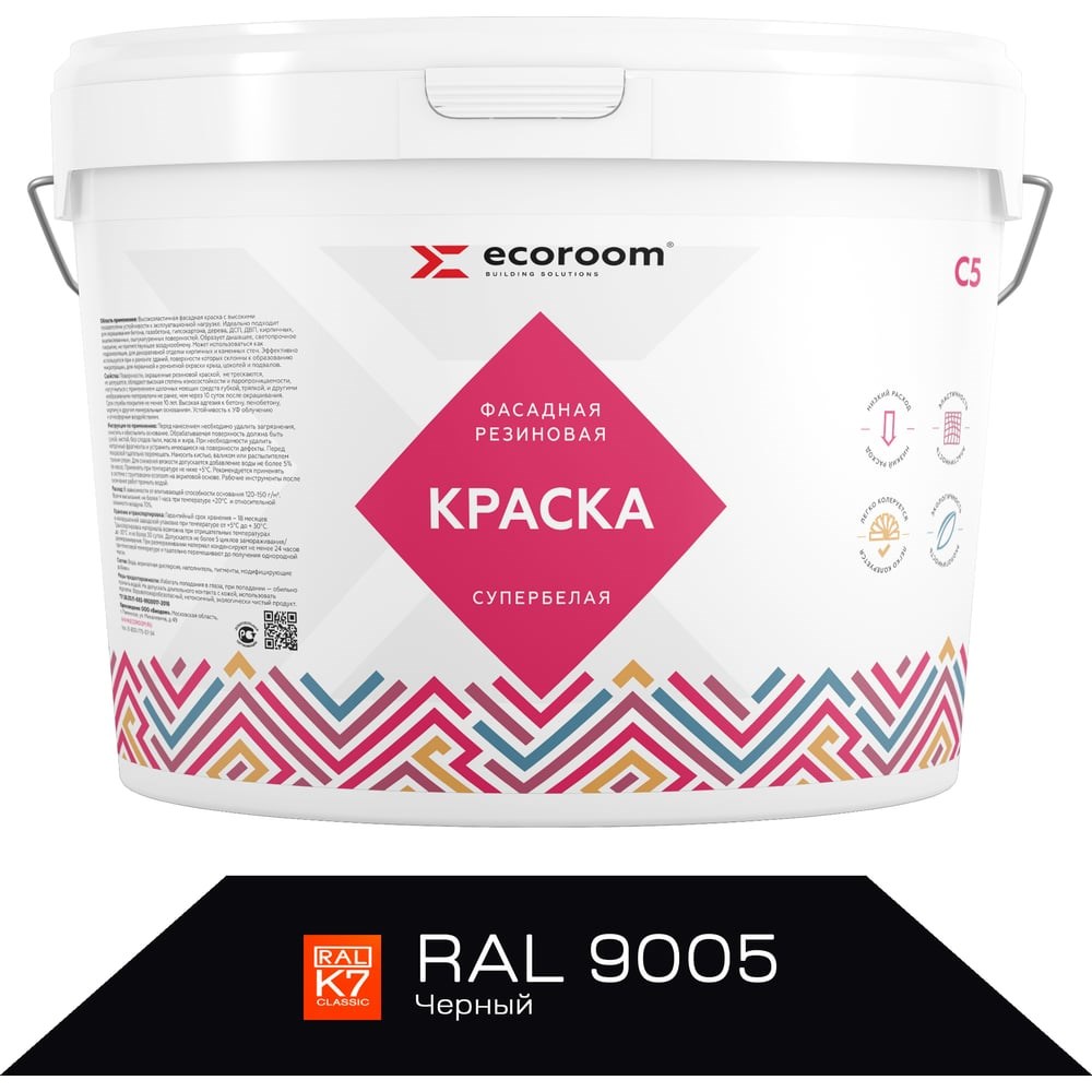 Фасадная резиновая краска ECOROOM RAL 9005 черный, 14 кг, Е-Кр -119/9005 - высокоэластичная фасадная краска с высокими показателями устойчивости к эксплуатационной нагрузке. Идеально подходит для окрашивания бетона, газобетона, гипсокартона, дерева, ДСП, ДВП, кирпичных, зашпаклеванных, оштукатуренных поверхностей. Образует дышащее, светопрочное покрытие, не препятствующее воздухообмену. Может использоваться как гидроизоляция, для декоративной отделки кирпичных и каменных стен. Эффективно используется при и ремонте зданий, поверхности которых склонны к образованию микротрещин, для первичной и ремонтной окраски крыш, цоколей и подвалов.