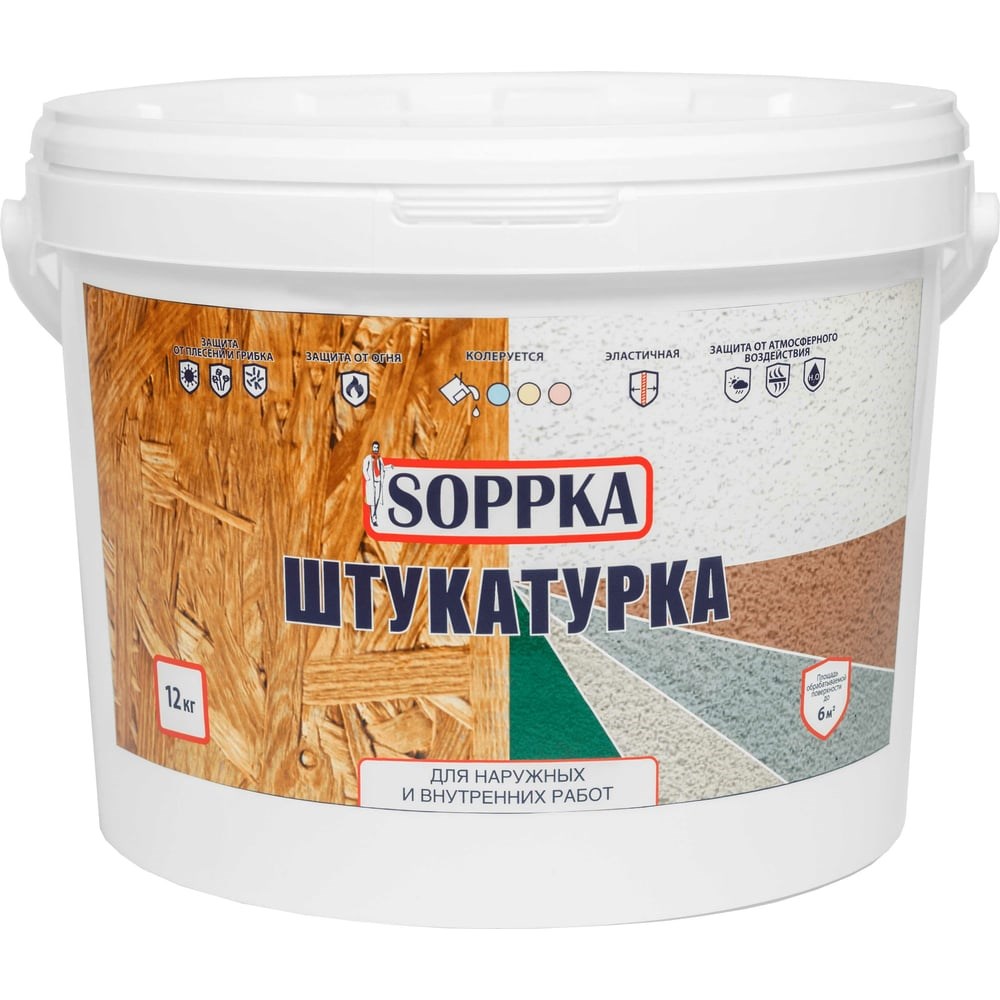 Декоративная штукатурка для OSB SOPPKA 12кг СОП-Штукатур12 применяется для отделки OSB, SIP, ДВП, ДСП, фанеры и древесины.Преимущества:Для наружных и внутренних работ.Образует долговечное эластичное покрытие с декоративным эффектом “шуба”.Полностью скрывает дефекты и неровности, структуру, цвет OSB.Обеспечивает защиту от плесени и грибка, от атмосферных осадков, выдерживает перепады температур от -20ºС до +35ºС.Не растрескивается.Выпускается белого цвета, возможна колеровка (база А).Наносится шпателем, для придания дополнительной текстуры могут использоваться кисть, валик, в том числе декоративный.Рекомендуется использовать совместно с эластичным герметиком SOPPKA Smart Elastik и грунтом SOPPKA Primer.РАСХОД: Расход на один слой зависит от свойств окрашиваемой поверхности и в среднем составляет 2 кг/м².Время высыхания при температуре 20 ºС и относительной влажности 65% ‒ 24 часа. При более низких температурах время высыхания увеличивается. После нанесения состава поверхность необходимо предохранять в течение 2 суток от атмосферных осадков.