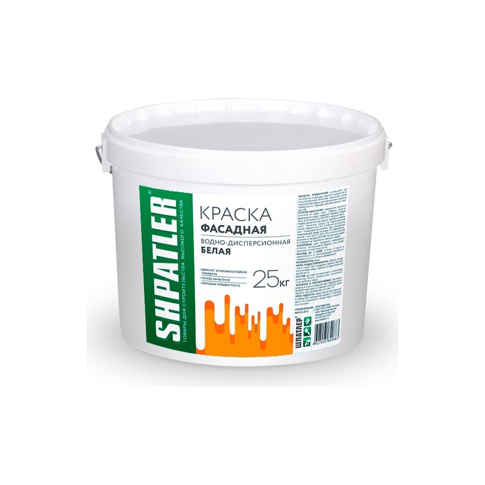 Фасадная водно-дисперсионная краска Шпатлер белая, 25 кг Ш00062 предназначена для нанесения на фасады зданий и сооружений по оштукатуренным, бетонным, кирпичным, деревянным и ранее окрашенным (водно-дисперсионными красками) поверхностям. Подходит для работ внутри помещений.