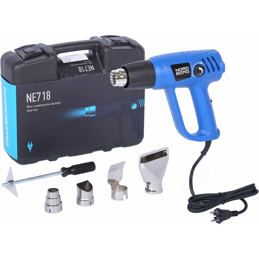 Технический фен NORDBERG NE718 – электроинструмент для работы с различными материалами в автосервисах, СТО, на промышленных предприятиях, в частных гаражах и для бытового применения. Функционал Предназначен для создания потока горячего воздуха в диапазоне от 50 до 600 °С. Может быть использован для: сушки или снятия лакокрасочных покрытий сушки клеевых соединений и клейки путем нагрева сушки штукатурки, шпатлевки, изделий из гипса и аналогичных материалов монтажа, окантовок, трубок и прочего методом горячей усадки посадки с нагревом горячей деформации или получения необходимой формы поверхности или предмета размораживания труб разъема резьбовых соединений сушки излишней влаги пайки лужения дезинфекции и т. д. Преимущества и особенности Два режима подачи воздуха с регулировкой температуры: 1 режим 50-450 °С, 2 режим 90-600 °С Мощность 2000 Вт Четыре насадки в комплекте: 1) отражатель для нагрева трубок, 2) редукционная для точечного нагрева, 3) для защиты стекла, 4) “рыбий хвост” для распределения горячего воздуха на большой площади Длина кабеля 2 метра