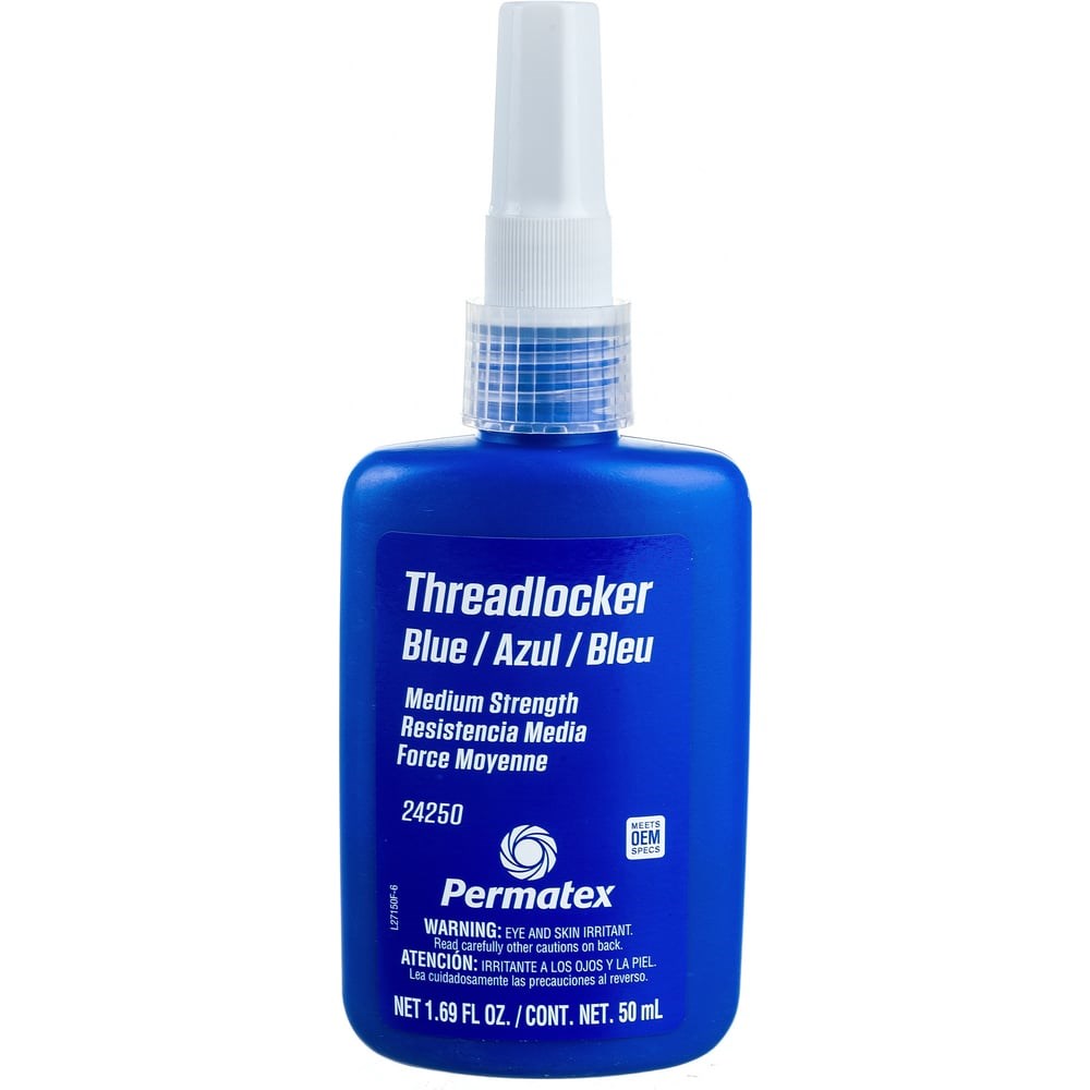 24250 Анаэробный фиксатор резьбы от 6 до 20 мм. Синий - средняя фиксация. 50 мл. Улучшенная замена стопорным шайбам. Склеивает металлические поверхности, когда после сборки к ним прекращается доступ кислорода. Одновременно стопорит, герметизирует и защищает резьбу от коррозии. Широко используется как в промышленности, так и в бытовой сфере. Сертифицирован к применению автоконцернами GM, Mercedes, BMW, Ford. Применение: Нанести на первые 2-3 витка резьбы и собрать детали. Для ускорения процесса при низких температурах, а также для неактивных поверхностей используйте аэрозольный праймер-активатор Permatex 24163. Состав: полигликоль диметакрилат >30%, полигликоль олеат <30%, аморфный кремнезем <5%, кумил гидропероксид <5%. Хранить в сухом и прохладном месте. Беречь от детей.