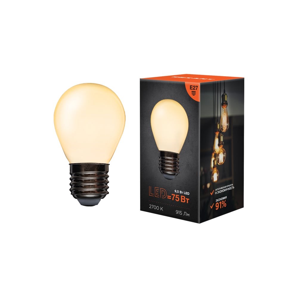 Филаментная лампа REXANT Шарик GL45 9.5 Вт 2700K E27 матовая колба 604-135 прекрасно подходит для дизайнерского освещения комнат, домов, гостиниц, кафе, и других объектов. Филаментные светодиодные лампочки вобрали в себя все лучшие свойства, присущие матричным LED-лампам и традиционным лампам накаливания. За счет распространения света во всех направлениях, филаментные лампочки REXANT потребляют еще меньше электроэнергии при более высокой яркости. Утилизации ламп не требует особых мер. Их можно вынести с бытовыми отходами, так как они безопасны и для окружающей среды.