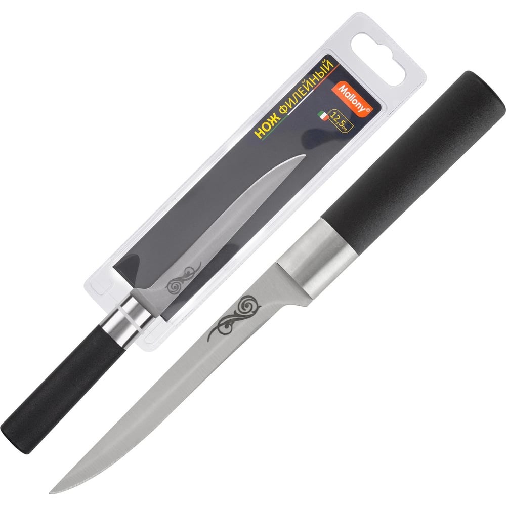 Нож с пластиковой рукояткой MAL-04P филейныйДлина лезвия: 12,5 смТолщина лезвия: 1 ммЛитая противоскользящая пластиковая ручкаМатериал: нержавеющая сталь (3CR13), пластмассаЦвет ручки: черный