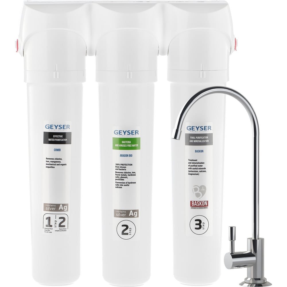 В фильтрах серии Гейзер Смарт реализованы основные методы очистки воды: механическая фильтрация, ионный обмен, сорбция, обезжелезивание и обеззараживание. Свойственный материалу Арагон эффект квазиумягчения позволяет получить не только идеально чистую и безопасную, но вкусную и полезную воду.Фильтры воды Гейзер Смарт отличает логичность и продуманность каждого этапа очистки, в результате вся система в целом имеет гарантированно высокий ресурс и стабильно эффективную степень очистки на протяжении всего срока службы.Конструкция фильтров Гейзер Смарт позволяет быстро менять картриджи.Воду, очищенную фильтрами Гейзер Смарт Био, можно пить без кипячения.Фильтры серии Гейзер БИО — единственные на российском рынке фильтрующие системы, получившие сертификат соответствия по системе ГОСТ Р:ГОСТ Р 51232-98 (Вода питьевая) ГОСТ Р 51871-02 (Устройства водоочистные) СанПиН 2.1.4.1074 (Питьевая вода)При фильтрации вода проходит следующие ступени очистки:Картридж Комби Смарт необходим для предварительной очистки воды. Состав включает Арагон, кокосовый активированный уголь и серебро.Арагон Смарт БИО очищает воду от тяжелых металлов, хлора и других вредных примесей. В результате улучшается вкус и цвет воды. Кроме того, на данном этапе из воды удаляются бактерии и вирусы до 100%. Серебро не дает бактериям размножаться.Баскон Смарт на финишном этапе обогащает воду калием, магнием, кальцием, снижаетRedOx потенциал и количество свободных радикалов.