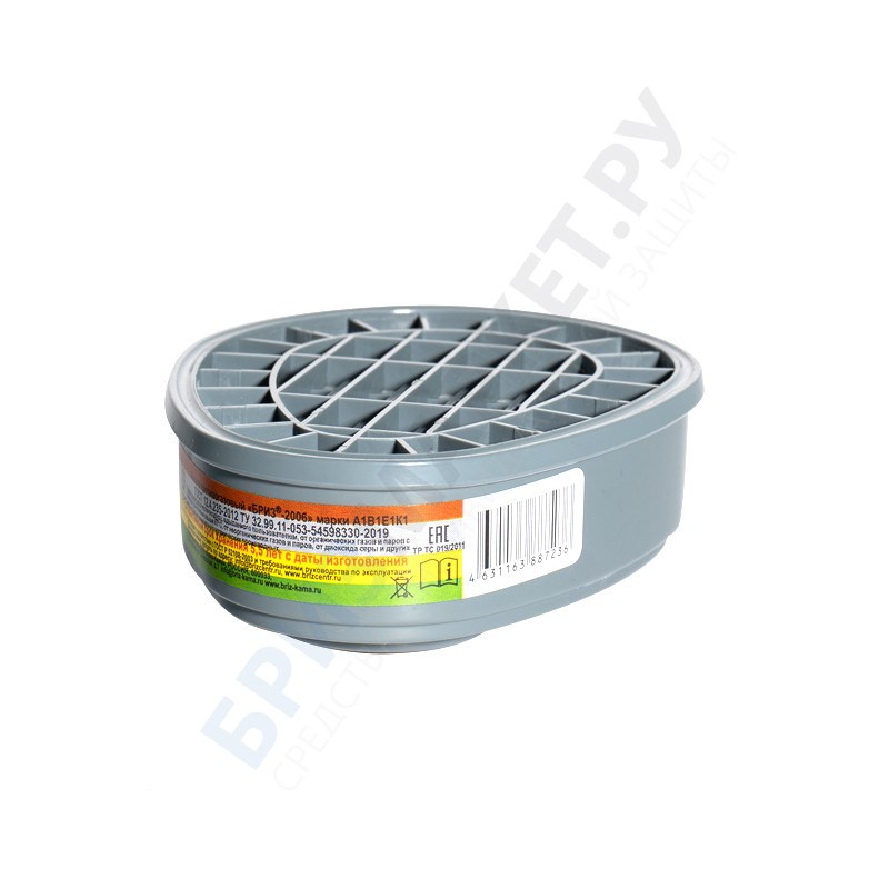 Фильтр противогазовый «БРИЗ®-2006» марки A1B1E1K1 предназначен: для очистки вдыхаемого человеком воздуха от: паров и газов органических веществ с температурой кипения выше 65°С (циклогексан, бензол, ксилол, толуол, ацетонитрил, нитробензол, тетраэтилсвинец, фенол, фурфурол и других) неорганических газов и паров (хлор, сероводород, синильная кислота, хлорциан, сероуглерод, йод и других,кроме оксида углерода) кислых газов и паров (диоксид серы, хлорид водорода, фосфин, арсин и других) аммиака и его органических производных Время защитного действия по циклогексану при С0=3500 мг/м3 70 мин по хлору при С0=3000 мг/м3 20 мин по сероводороду при С0=1400 мг/м3 40 мин по диоксиду серы при С0=2700 мг/м3 20 мин по аммиаку при С0=700 мг/м3 70 мин