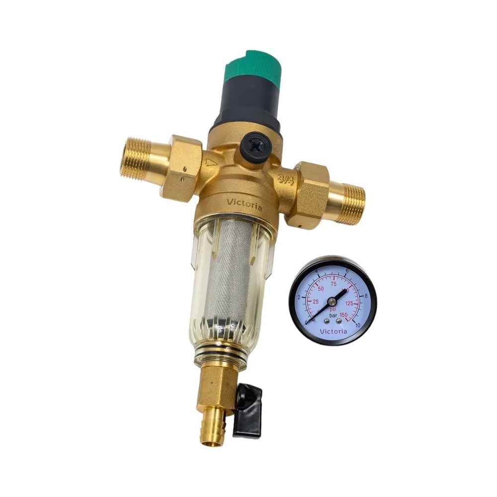 Промывной фильтр с редуктором давления и манометром для холодной воды Victoria 1/2"(тонкая очистка)с американками 27-706
