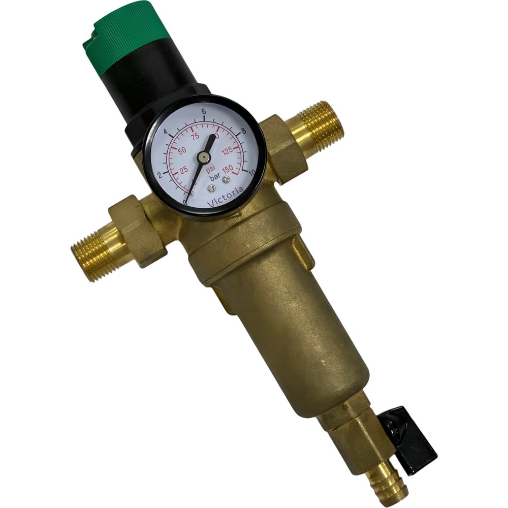 Промывной фильтр с редуктором давления и манометром для горячей воды Victoria 1/2"(тонкая очистка)с американками 27-707