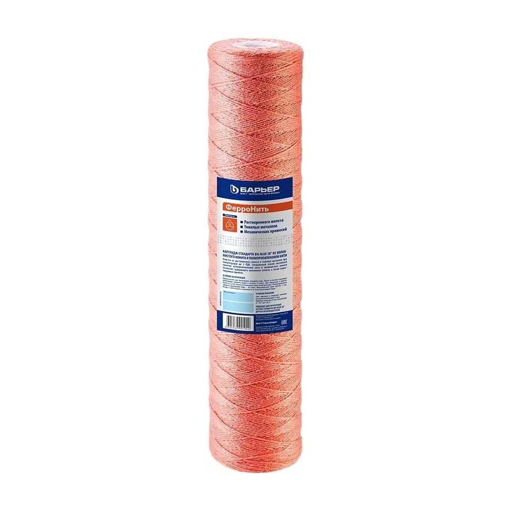 Фильтроэлемент ФерроНить BB 20 Барьер Р542Р01 предназначен для очистки холодной воды от растворенного железа, тяжелых металлов и нерастворимых механических загрязнений. Изготовлен из волокнистого материала и полипропиленовой нити. Используется в магистральных фильтрах Барьер стандарта Big Blue 20".
