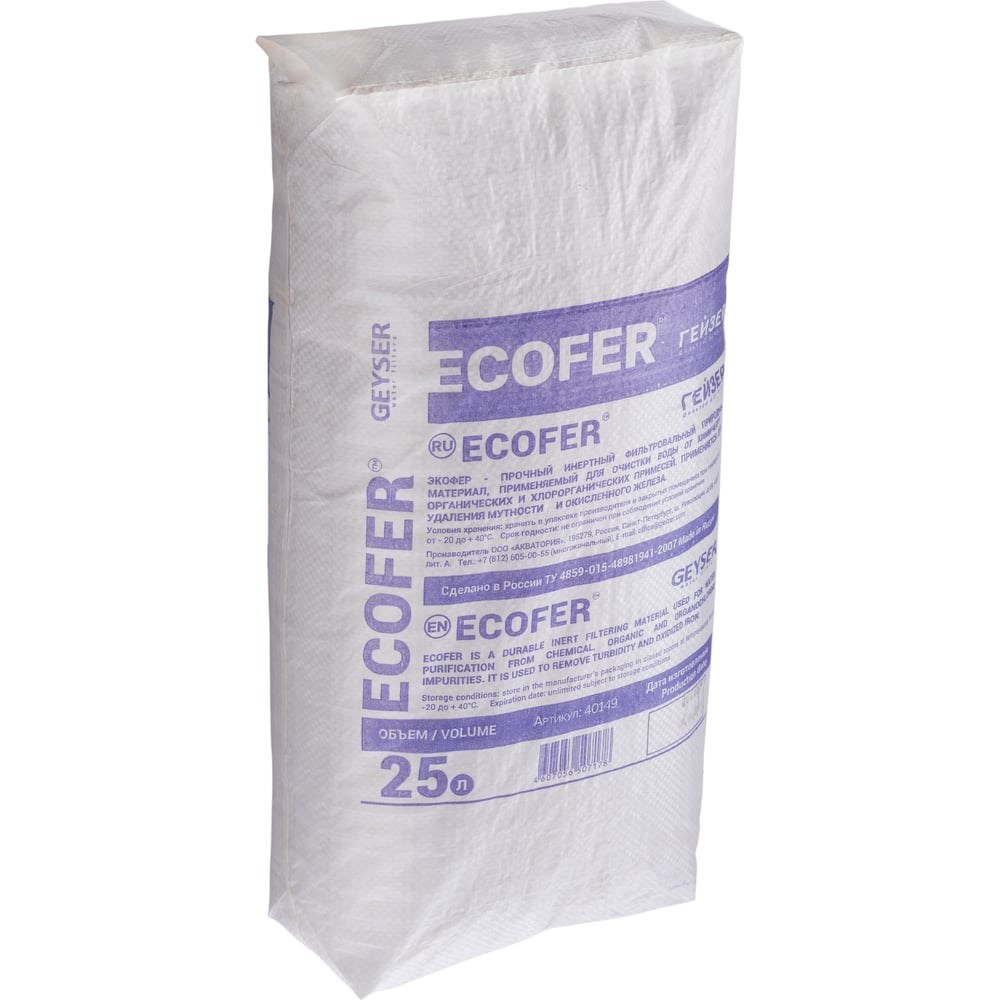 Фильтрующая загрузка Гейзер Экофер 40149 является искусственным гранулированным каталитическим алюмосиликатным фильтрующим веществом, выполненным из природного сырья. Каталитически активные компоненты входят в структуру и обеспечивают эффективную работу даже при ее разрушении. Для регенерации фильтрующей способности не требуются химические реагенты, достаточно его обратной промывки. При прохождении воды через EcoFER железо Fe²+ и марганец Mn2+,растворенные в воде,образуют осадок (гидроксиды железа и марганца), который задерживается в толще загрузки и потом легко удаляется из нее при промывке системы (регенерации). Представленная загрузка широко применяется в напорных и безнапорных системах по очистке воды. Объём 25л. Вес 16 кг.