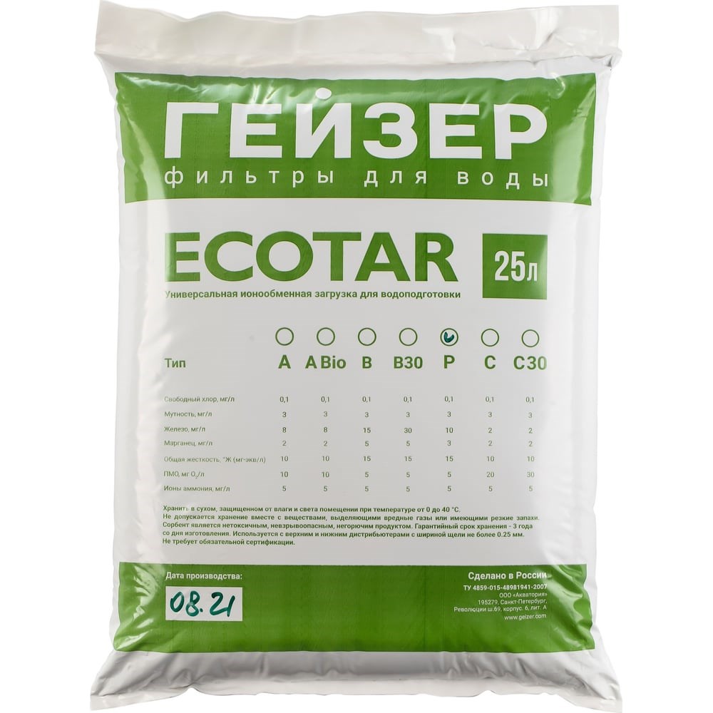 Мультикомпонентная фильтрующая загрузка Экотар P – используется для водоподготовки в загородных домах, производствах, котельных, предприятиях общественного питания и др. Рекомендуется для очистки воды из артезианских скважин от растворённого железа (до 10 мг/л), марганца и солей жесткости при незначительном содержании органических веществ. Визуальная оценка исходной воды: первоначально прозрачная, при отстаивании желтеет и даёт бурый осадок. Регенерация фильтрующей загрузки Экотар P производится раствором соли (в солевом баке). Расход соли на регенерацию Экотар P - 110-130 г соли на 1л загрузки; Фильтрующая ёмкость 1л загрузки Экотар P - 1200 мг.экв. Экотар P работает при следующих показателях анализа воды: Растворённое железо: до 10 мг/л; Марганец: до 3 мг/л; Жёсткость: до 15 мг. экв./л; ПМО: до 5 O2/л; Мутность: не более 3 мг/л; Сероводород (запах тухлых яиц): отсутствует. Гарантийный срок хранения – 3 года со дня изготовления. Объём: 25 л.