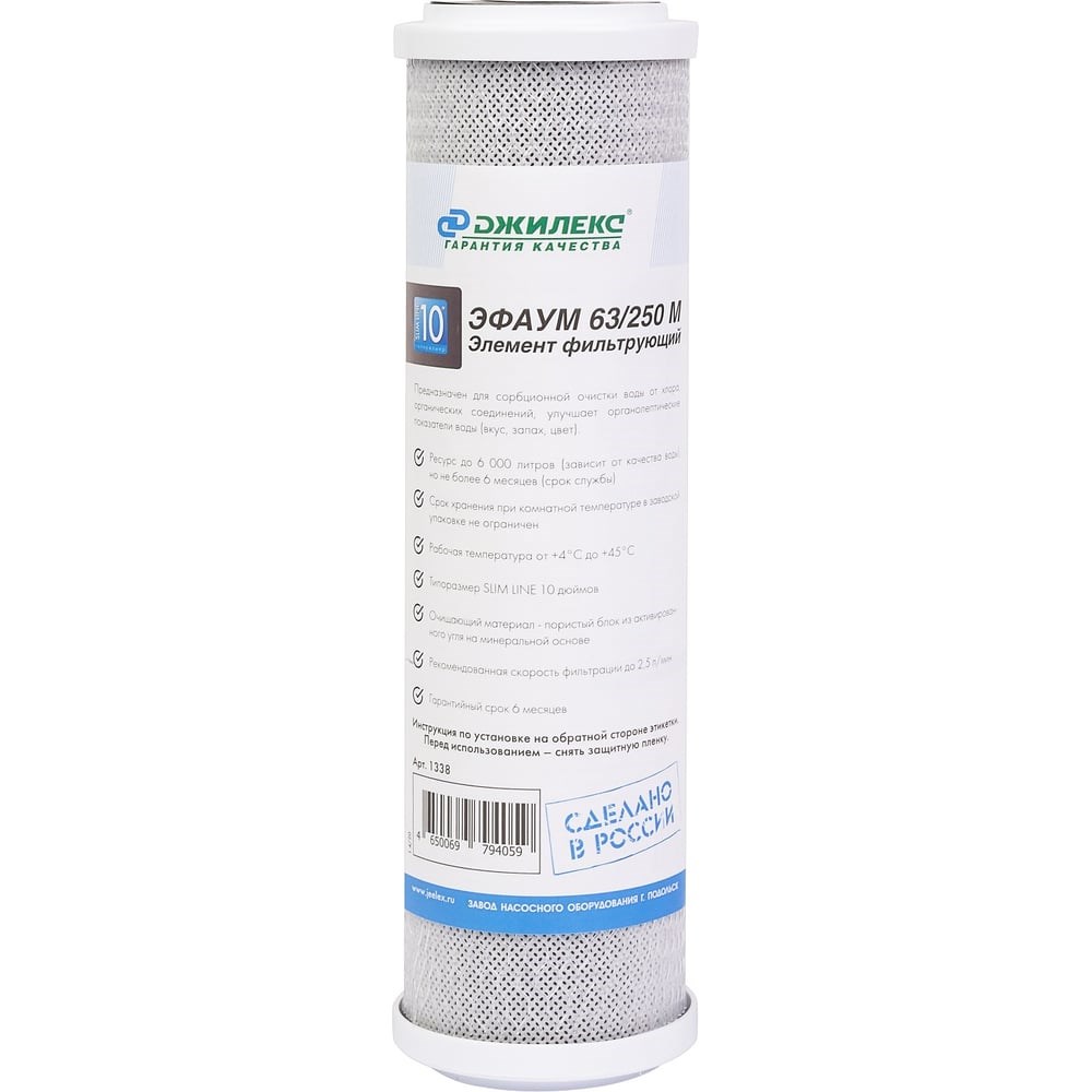 Картридж ДЖИЛЕКС Элемент фильтрующий ЭФАУМ 63/250М 1338 предназначен для сорбционной очистки воды от хлора, органических соединений, улучшает органолептические показатели воды (вкус, запах, цвет). Очищающий материал - пористый блок из активированного угля на минеральной основе.