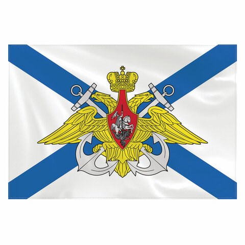 Флаг Военно-Морского Флота России "Андреевский флаг" представляет собой прямоугольное двухстороннее полотно белого цвета, пересечённое синим диагональным (Андреевским) крестом, содержит эмблему ВМФ. Яркое изображение с двух сторон флага. Полотно флага оснащено карманом под флагшток, есть закрепляющие завязки снизу. Флаг выполнен из плотного полиэстера. Размер - 90х135 см, плотность материала - 68 Ден. Флагшток не входит в комплект.