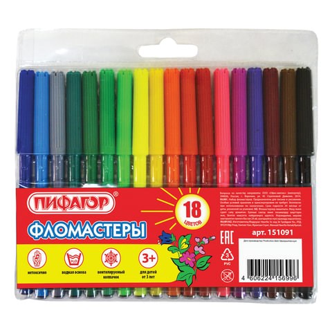 Фломастеры ПИФАГОР, 18 цветов, вентилируемый колпачок, 151091