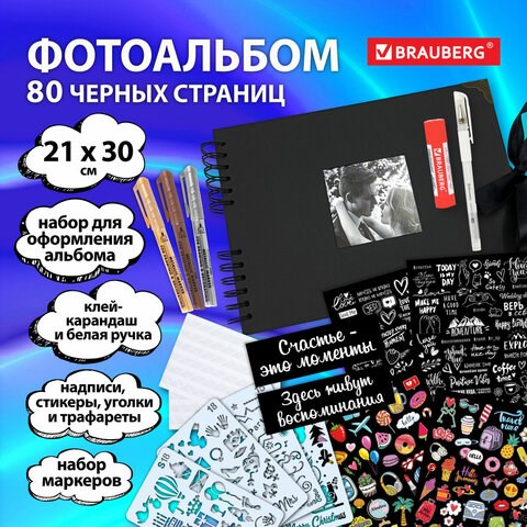 Фотоальбом 21х30 см, 40 черных листов, уголки/стикеры/ручка/клей/трафареты/маркеры, BRG Black, 880654