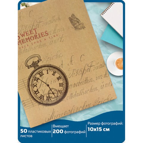 Фотоальбом BRAUBERG "Часы, крафт" на 200 фото 10х15 см, твердая обложка, термосварка, 391165