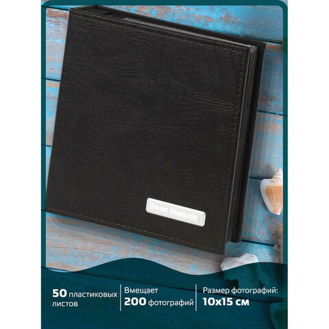 Состоит из 50 полипропиленовых листов размером 15,5х24,5 см с карманами и вмещает 200 фотографий размером 10х15 см, по 2 штуки на странице. Обложка фотоальбома выполнена в темно-коричневом цвете и стилизована под фактурную кожу. Фотоальбом с книжным переплетом отличается повышенной прочностью и долгим сроком службы. Размер - 20,7х21,8 см.