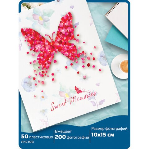 Состоит из 50 полипропиленовых листов размером 17,5х22 см с карманами и вмещает 200 фотографий размером 10х15 см по 2 штуки на странице. Обложка фотоальбома выполнена в романтическом стиле. Размер - 18х23 см.