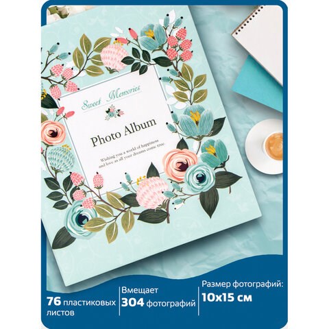 Состоит из 76 полипропиленовых листов размером 17,5х22 см с карманами и вмещает 304 фотографии размером 10х15 см по 2 штуки на странице. Обложка фотоальбома выполнена в бирюзовых тонах с цветочным узором, а его листы склеены в единый блок. Размер альбома - 18х23 см.
