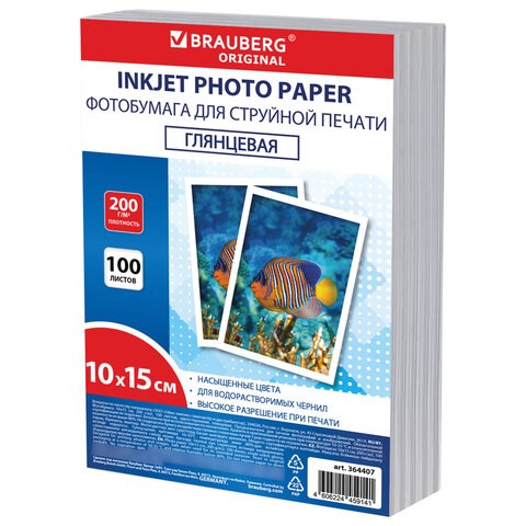 Фотобумага глянцевая, 10х15 см, 200 г/м2, односторонняя, 100 листов, ПАКЕТ, BRAUBERG ORIGINAL, 364407
