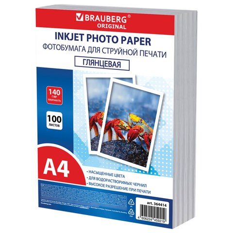 Фотобумага глянцевая, А4, 140 г/м2, односторонняя, 100 листов, ПАКЕТ, BRAUBERG ORIGINAL, 364414