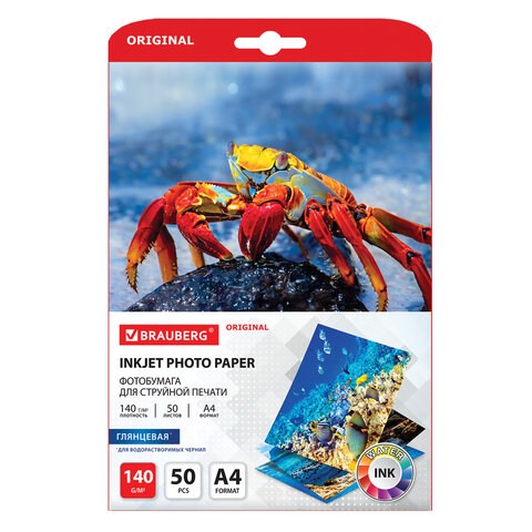 Фотобумага глянцевая, А4, 140 г/м2, односторонняя, 50 листов, BRAUBERG ORIGINAL, 363982