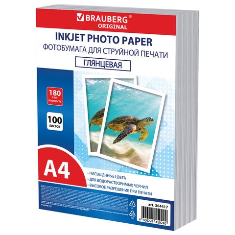 Фотобумага глянцевая, А4, 180 г/м2, односторонняя, 100 листов, ПАКЕТ, BRAUBERG ORIGINAL, 364417