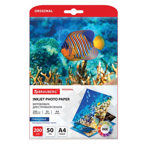 Фотобумага глянцевая, А4, 200 г/м2, односторонняя, 50 листов, BRAUBERG ORIGINAL, 363988