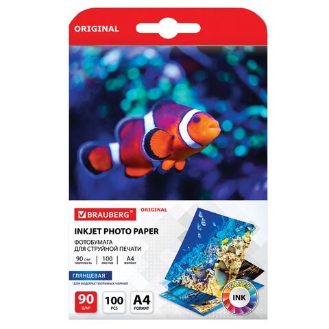 Фотобумага глянцевая, А4, 90 г/м2, односторонняя, 100 листов, BRAUBERG ORIGINAL, 363978