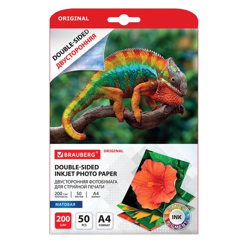 Фотобумага матовая, А4, 200 г/м2, двусторонняя, 50 листов, BRAUBERG ORIGINAL, 363989