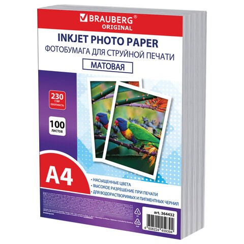 Фотобумага матовая, А4, 230 г/м2, односторонняя, 100 листов, ПАКЕТ, BRAUBERG ORIGINAL, 364432