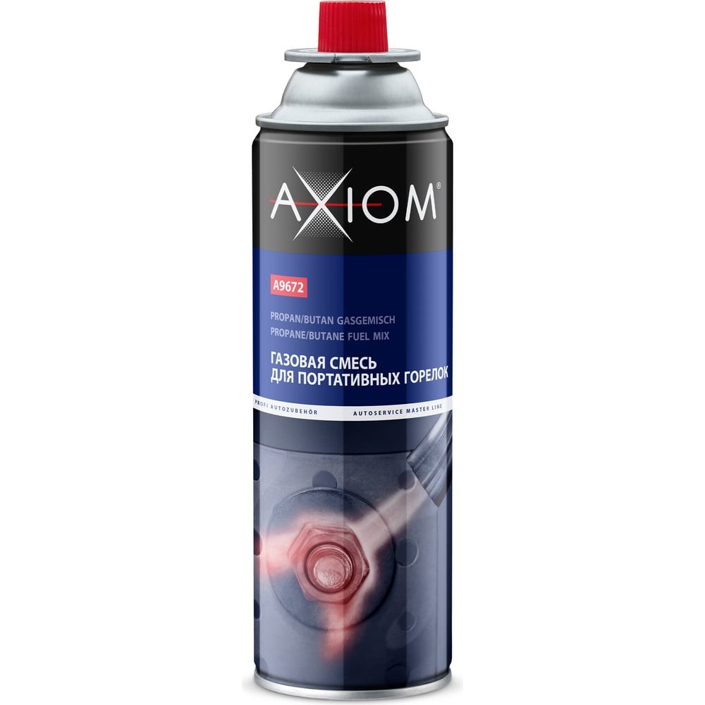 Газовая смесь для портативных горелок AXIOM A9672 особой чистоты. Предназначена для использования в портативных газовых горелках, применяющихся для облегчения разборки корродировавших резьбовых соединений, упрощения рихтовки кузовных деталей, запрессовки подшипников, втулок и пальцев. Оригинальный состав продукта имеет низкую температуру кипения газовой смеси и повышенную теплотворную способность, что обеспечивает: стабильное горение при температурах до –20 °C; высокую удельную теплоту сгорания смеси, позволяющую экономно расходовать газ.