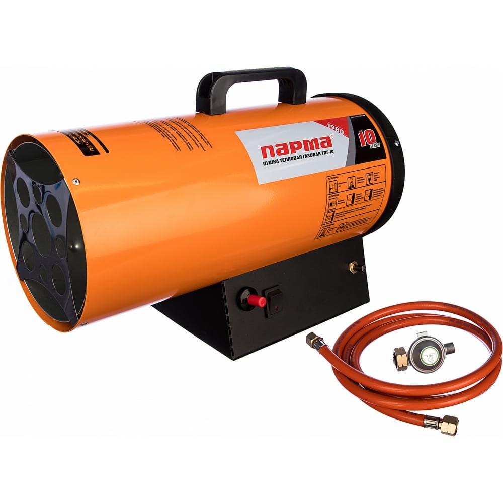Газовая тепловая пушка Парма ТПГ- 10 необходима для просушки и обогрева складских помещений, цехов или строительных площадок. Устройство подключается к сети 220В и работает на газе пропан\бутан. На основании расположены элементы управления. Прочный корпус расположен на устойчивой основе и обладает ручкой для удержания и транспортировки. Защитная решетка предотвращает попадание посторонних предметов внутрь пушки. Пушку рекомендуется использовать в хорошо проветриваемых помещениях. Длина сетевого кабеля 1,2 метра.