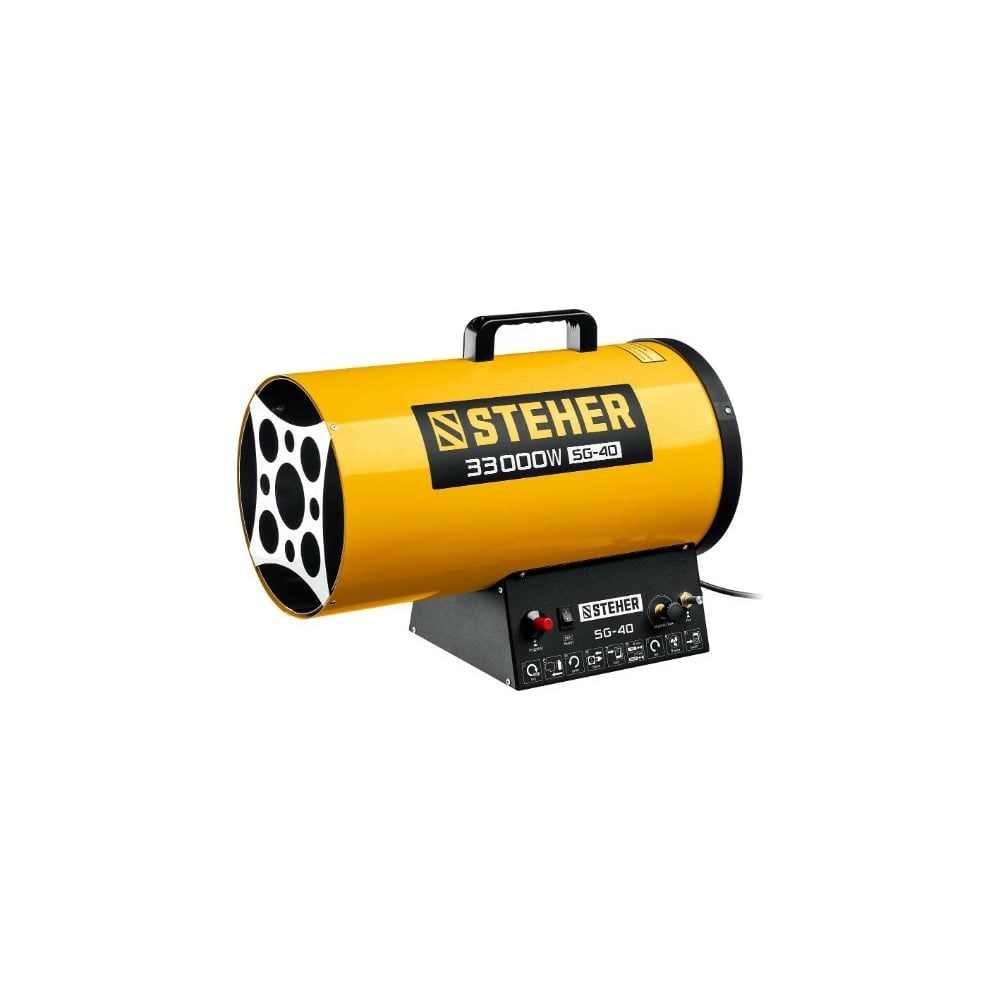 Газовая тепловая пушка STEHER 33 кВт SG-40 предназначена для генерации горячего воздуха, который может быть использован для обогрева, сушки промышленных, складских, вспомогательных помещений и т. д. Устройство имеет компактный корпус, контроль наличия пламени, биметаллический термопредохранитель и двойное теплоэкранирование. Имеется пьезоподжиг, армированный газовый шланг с редуктором давления в комплекте. Тип газа - пропан/пропан-бутан/бутан.