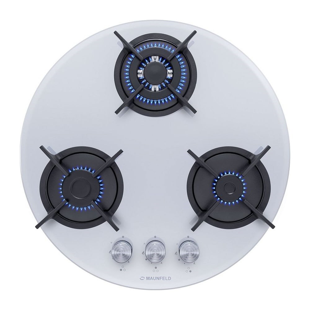 Оригинальная круглая встраиваемая газовая варочная панель шириной 52 см идеальное решение для угловой столешницы. Может работать от магистрального газа и газа в баллоне (тип G30), для этого достаточно поставить специальные жиклеры французской фирмы SOURDILLON, находящиеся в комплекте. Панель выполнена из закаленного стекла белого цвета. В данной модели установлены высококачественные итальянские горелки SABAF. Две конфорки мощностью 1200 Вт и 1700 Вт и одна мощная WOK-конфорка с двойным пламенем мощностью 3500 Вт. Укомплектованы круглыми чугунными решетками. Регулирование подачи газа и электроподжиг конфорок происходит с помощью поворотных полнотелых цельнометаллических ручек. Для простоты использования около каждой ручки нанесены информационные изображения: используемая конфорка, подача газа выключена, электроподжиг, максимальное пламя и минимальное пламя. Система газ-контроля надежно защищает бытовой прибор от утечек газа при неожиданном затухании конфорки.
