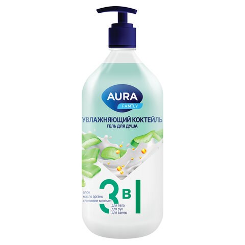 Гель для душа 3 в 1 для тела, рук и ванны 1 л, AURA FAMILY "Увлажняющий коктейль", дозатор, 14953