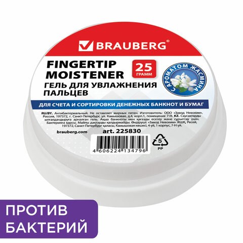Гель для увлажнения пальцев АНТИБАКТЕРИАЛЬНЫЙ BRAUBERG 25 г, c ароматом жасмина, голубой, 225830