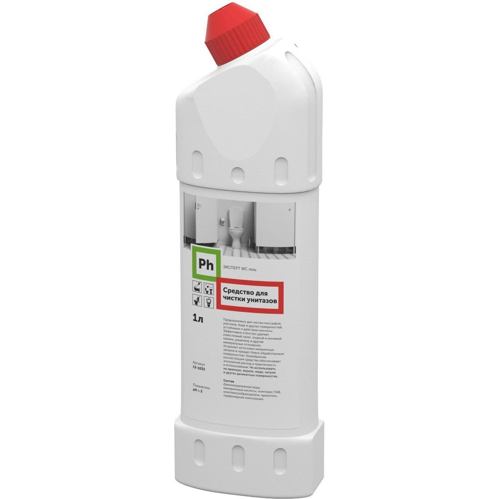 Гель PH WC 1л 13-1033 для чистки писсуаров, унитазов, биде и других поверхностей, устойчивых к действию кислоты. Средство эффективно при использовании, устраняет неприятный запах и придает блеск обработанным поверхностям. Внимание! Не использовать на мраморе, акриле, меди, латуни и других деликатных поверхностях.