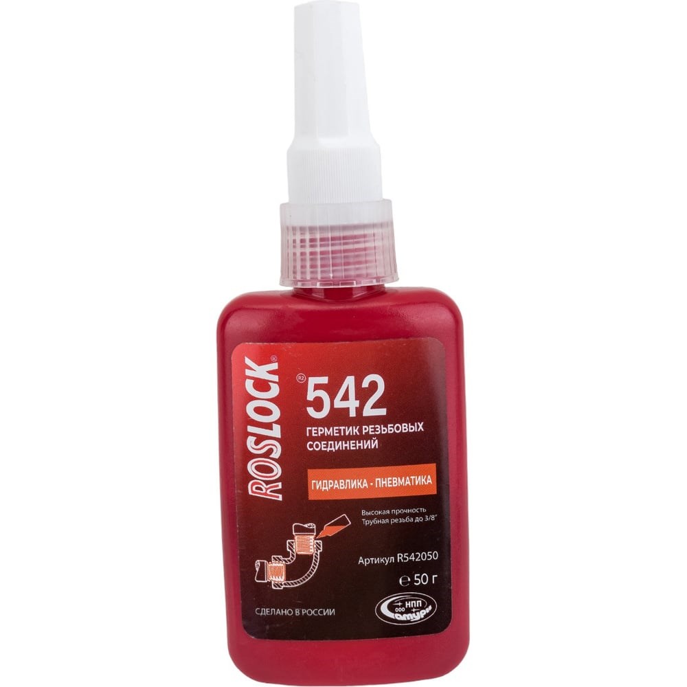 Герметик для металлических резьбовых гидравлических и пневматических соединений ROSLOCK 542 50 гр R542050 предназначен для работы с резьбой с сильной затяжкой: метрическая до М10, конусная, трубная 1/8" - 3/8", зазор в резьбе до 0,15 мм. Возможно, при разборке понадобится нагрев соединения. Свойства жидкого герметика Химическая основа: Диметакриловый полиэфир Внешний вид: Тиксотропная жидкость коричневого цвета Вязкость Брукфильду RVT при 25 °С по ГОСТ 25271: (A/2/2,5)1200 – 3000 мПа*с (A/2/20)350 – 800 мПа*с Температура вспышки: > 136 °С, не содержит растворителей Набор прочности Болт-гайка М10х1,5-6g/6H из стали марки 30 ГОСТ 1050 при (18 - 25) °С по ISO 10964: Ручная прочность (8 – 20) мин. Ручная прочность с активатором - до 5 мин. Функциональная прочность - через (3 – 6) ч Максимальная прочность - через 24 ч. Свойства отвержденного герметика Выдерживает температуру -60 °С ... 150 °С (4 ч до 180 °С). Метод испытаний при (18 - 25) °С: Изменение момента отвинчивания болт-гайка М10х1,5-6g/6H из стали марки 30 ГОСТ 1050 по ISO 10964. Момент страгивания (срыва) через 24 ч: (10 – 20) Н*м Момент отвинчивания через 24 ч: (15 – 30) Н*м Усилие выпрессовки (имитация сорванной резьбы): ≥ 5 МПа