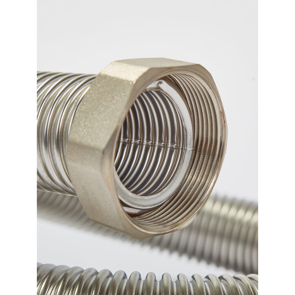 Гайка латунная хромированная ¾ - 2 шт. Труба гофрированная из нержавеющей стали ДУ20 Стопорное кольцо металлическое - 2 шт. Кольцо уплотнительное с бортиком - 2 шт. Области применения гибкой подводки из гофрированной нержавеющей стали: В системах водоснабжения, отопления, обвязки котельного оборудования и систем нагрева воды, В системах трубопроводов для кондиционеров, теплообменников и фанкойлов, В системах трубопроводов для ГСМ, В качестве металлорукавов для прокладки электропроводки, компьютерных сетей и прочих коммуникаций, В системах для отвода выхлопных газов. Преимущества гибкой подводки из нержавеющей стали: Простой и быстрый монтаж не требующий специальных навыков и оборудования, только ручной механический инструмент, что позволяет осуществлять монтаж специалисту любого уровня, а так же на объектах, где нет электричества. Неограниченный срок службы. Гибкость, позволяющая смонтировать систему любой сложности. Надежность соединения, рабочее давление от 6 до 12 бар в зависимости от диаметра. Устойчивость к гидроударам за счет своей гофрированной структуры, что исключает риск разрыва соединения. Устойчивость к отрицательным температурам, что позволяет применять подводку в системах смонтированных в помещениях с отрицательной температурой.