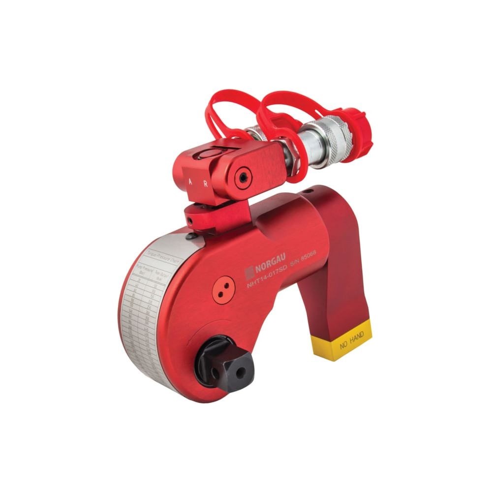 Гидравлический моментный гайковерт 172-1725 Нм, 3/4", тип NHT14-017SD, NORGAU 058110003 предназначен для контролируемой затяжка резьбового соединения с требуемым моментом. Инструмент имеет низкий вес при высокой мощности, поэтому рука не будет уставать при долгой деятельности. Корпус из алюминиевого сплава защищает внутренние узлы от повреждений, благодаря чему аппарат имеет долгий срок службы. Рабочее давление в 700 бар обеспечивает работу с крепежом, с которым не справляется гаечный ключ. На корпусе инструмента расположена таблица соответствия давления и крутящего момента для удобства работы. Резьбовые быстроразъемные соединения расположенные на шарнирах с возможностью поворота 360°х180° для подключения шлангов. Реакционная опора вращается относительно оси гайковерта на 360°.