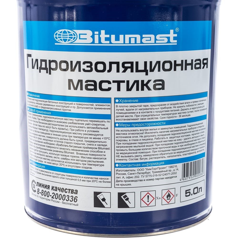ПРИМЕНЕНИЕВысококачественная обмазочная гидроизоляция бетонных конструкций и деревянных поверхностей, элементов фундамента, заглубляемых в землю.ОПИСАНИЕ МАТЕРИАЛАБитумная гидроизоляционная мастика Bitumast представляет собой полностью готовый к применению продукт на основе нефтяного битума, содержащий профессиональные технологические добавки и растворитель.ПРЕИМУЩЕСТВАготова к применениюсодержит антисептическую добавкувозможно наносить методом безвоздушного распыленияТЕХНОЛОГИЯ ПРИМЕНЕНИЯМастику тщательно перемешать по всему объему. Обрабатываемая поверхность должна быть сухой, предварительно очищенной от грязи, непрочных остатков старого покрытия. Наносится при помощи кисти, валика, а также методом безвоздушного распыления с диаметром сопла ≥1,5 мм. При механическом методе безвоздушного распыления, мастику возможно разбавить уайт-спиритом, сольвентом (не использовать автомобильное топливо) в пропорции 10% растворителя к общему объёму продукта. Наносится в 2-3 слоя, в зависимости от поверхности. При работе в условиях низких температур рекомендуется отогреть в течение суток при температуре не менее +15ºС. Перед нанесением рекомендуется обработать поверхность битумным праймером Bitumast. Допускается использовать не ниже - 20ºС (предварительно отогрев).ХРАНЕНИЕВ герметично закрытой таре, предохраняя от прямых солнечных лучей, вдали от нагревательных приборов при температуре от -30ºС до +50ºС. Гарантийный срок хранения в герметичной упаковке - 36 месяцев.