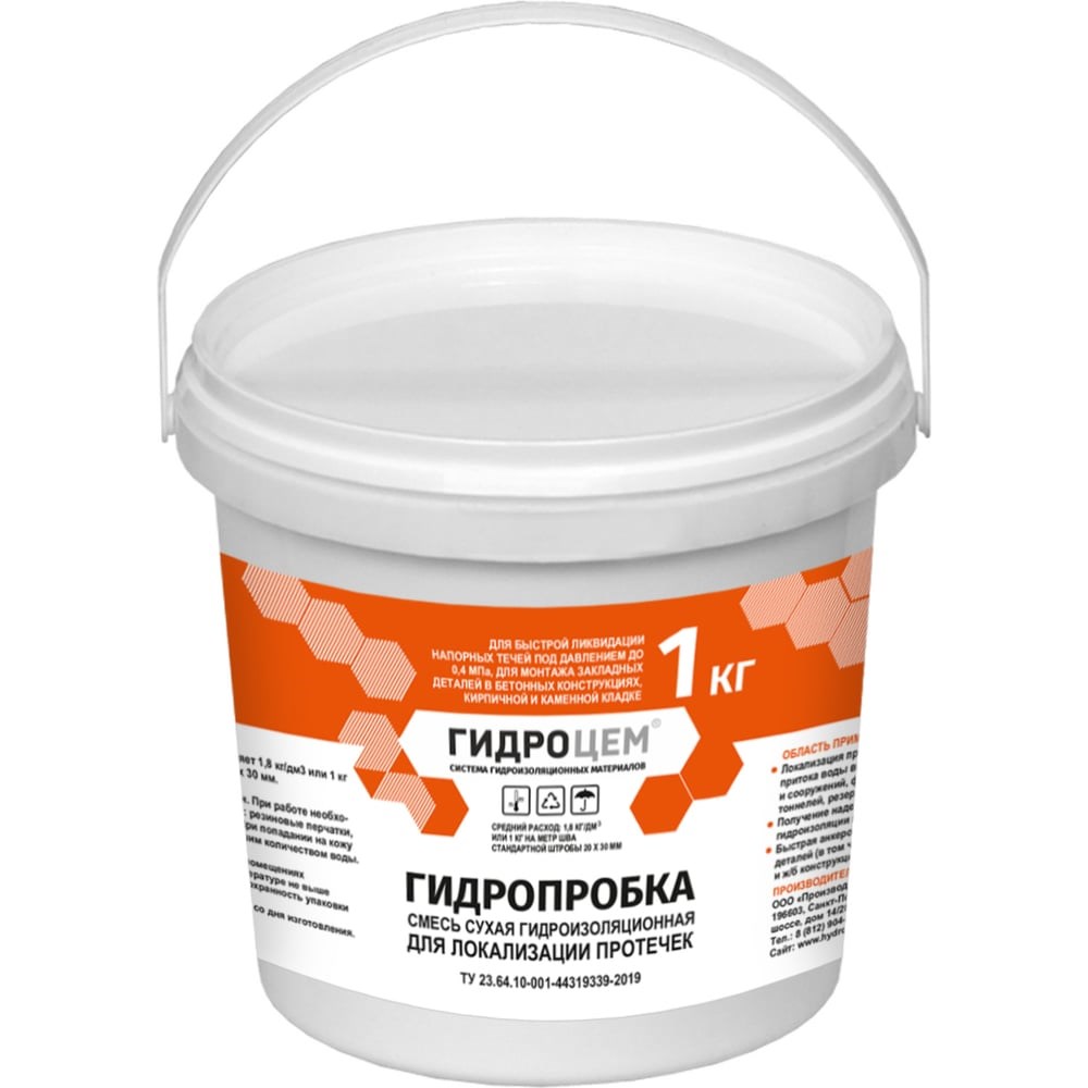 Гидроизоляция Гидроцем Гидропробка 1 кг Г00082 предназначена для устранения активных протечек в бетоне и каменной кладке. При смешивании с необходимым количеством воды образуется сверхбыстротвердеющая, безусадочная, тиксотропная растворная смесь. Не содержит растворителей и других веществ, опасных для здоровья. Материал, согласно ГОСТ 32016-2012, применим для следующих принципов и методов ремонта бетонных конструкций: №1 защита от проникания – заполнение трещин №2 регулирование влагосодержания — метод покрытия Технические характеристики Расход воды для затворения 1 кг сухой смеси: 0,19-0,2 л Жизнеспособность:начало схватывания 1 мин., окончание схватывания 4 мин. Марка по водонепроницаемости: через 24 часа min W6 Прочность на сжатии при отверждении в воде:1 час - min 7 МПа, 28 суток - min 40 МПа Прочность сцепления с бетоном:1 час - min 0,5 МПа, 28 суток - min 1,5 МПа Минимальная толщина нанесения: 30 мм Максимальная толщина нанесения: 50 мм
