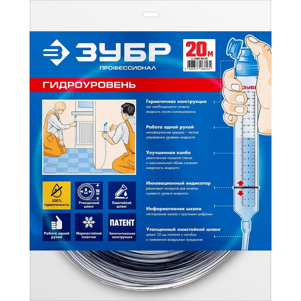 Строительный гидроуровень ЗУБР Профессионал 20 м 3482-08-20 - измерительный прибор. Помогает точно определить расположение в горизонтальной плоскости самых верхних точек элементов строительной конструкции. Применяется в профессиональной строительной сфере - при заливке фундамента, выравнивании полов, возведении кирпичных стенок. Работает этот прибор по принципу сообщающихся сосудов. Состоит из пары измерительных колб и шланга, длиною 20 метров. Дополнительные характеристики: Диаметр шланга - 10 мм.
