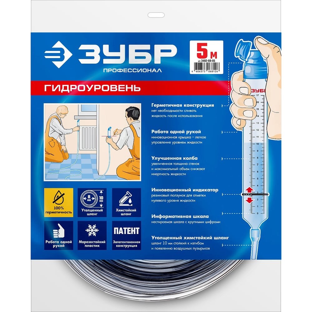 Строительный гидроуровень ЗУБР Профессионал 5 м 3482-08-05 - измерительный прибор, с помощью которого можно точно определить и выровнять расположение верхних элементов строительной конструкции, относительно горизонтальной плоскости. В основе работы - принцип сообщающихся сосудов. Прибор состоит из пары колб, соединенных длинным прозрачным шлангом диаметром - 8 мм. Дополнительные характеристики: Диаметр шланга - 8 мм.